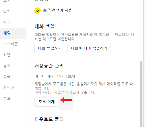 < PC 카톡 > 을 많이 이용하시는 분들도 [ ... ] 점3개 모양 설정 선택 > 채팅 > 저장공간관리 > 미디어 캐시 삭제 할 수 있습니다.